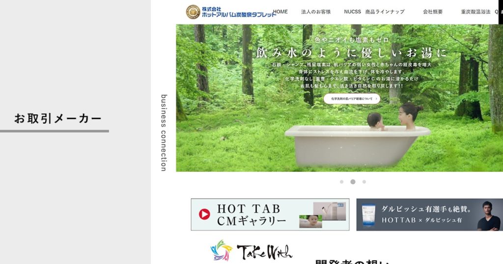 2023年8月11日 / 最終更新日時 : 2023年12月1日 takewith 取引会社 株式会社ホットアルバム炭酸泉タブレットのアイテムを取り扱い開始いたしました。 中性重炭酸入浴剤「ホットタブ(HOT TAB)」の製造・開発を行う株式会社ホットアルバム炭酸泉タブレット様と取引を開始いたしました。 株式会社TaKe Withは、身近な空間をより楽しく癒やしのある時間や空間にするアイテムを提案してまいります。 Follow me! FacebookXBlueskyHatenaCopy
